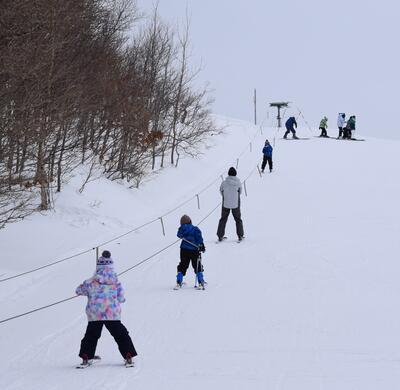 棒を背中にあてて乗るリフトで頂上まで。滑りたいところで自由に下りられるのも魅力。