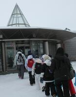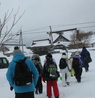 午前中、低学年はスノーシュー体験。普段行けないような雪道をサクサク歩いて行きました。