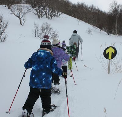 高学年は、「スノーシュー体験」平地コースを体験した低学年とは別の、「山コース」を体験!