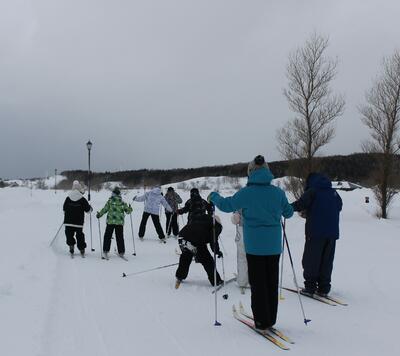 高学年は、「歩くスキー」と「ファットバイク」(タイヤが太く雪道での乗ることができる自転車)を体験しました。「歩くスキー」は、普段乗っているスキーと違うため、何度も転びながらコースを回りました。