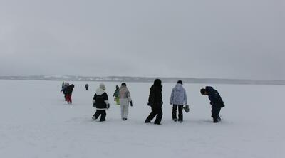 凍った大沼の上に立っています。ジャンプをしたり、穴を掘ろうとしたりしている子どもたち。