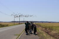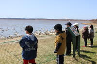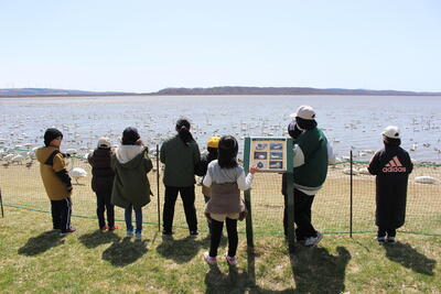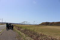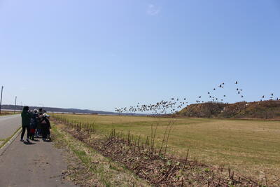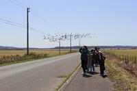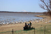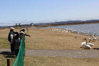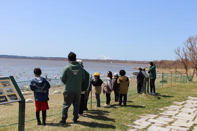 大沼に着くと、たくさんの白鳥がいました。今日は、3500羽もの白鳥がいるとのこと。一本足になって休んでいる白鳥や、沼に顔を突っ込んで餌を食べている白鳥など、いろいろな様子の白鳥を観察しました。