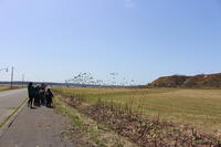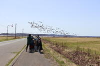 ふと見ると、広い草原に、たくさんの鳥が!(カモかガンだそうです)