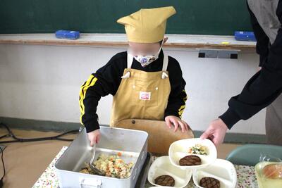 今日の「はじめて」は、音楽のお勉強と、給食当番です。