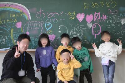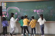 みんなで黒板にメッセージを書いてお祝いしました。