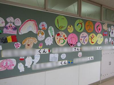 お兄さん、お姉さんの力作ぞろいの作品で飾られた、教室廊下の壁